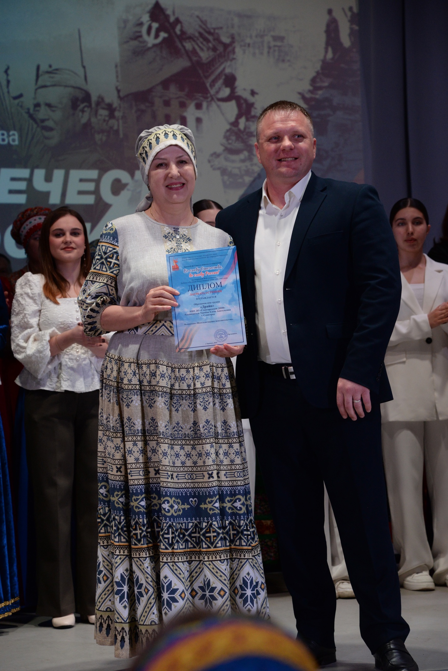 12 апреля на сцене ГДК прошел краевой этап фестиваля народного творчества «Во славу Отечества! Во славу России!», посвященный 80-летию Победы в Великой Отечественной войне. В нем приняли участие самодеятельные артисты из Кулундинского, Ключевского, Бурлинского районов, а также г.Яровое и г.Славгорода. В концертную программу вошли лучшие номера отборочного этапа, прошедшего в формате видеоконкурса.